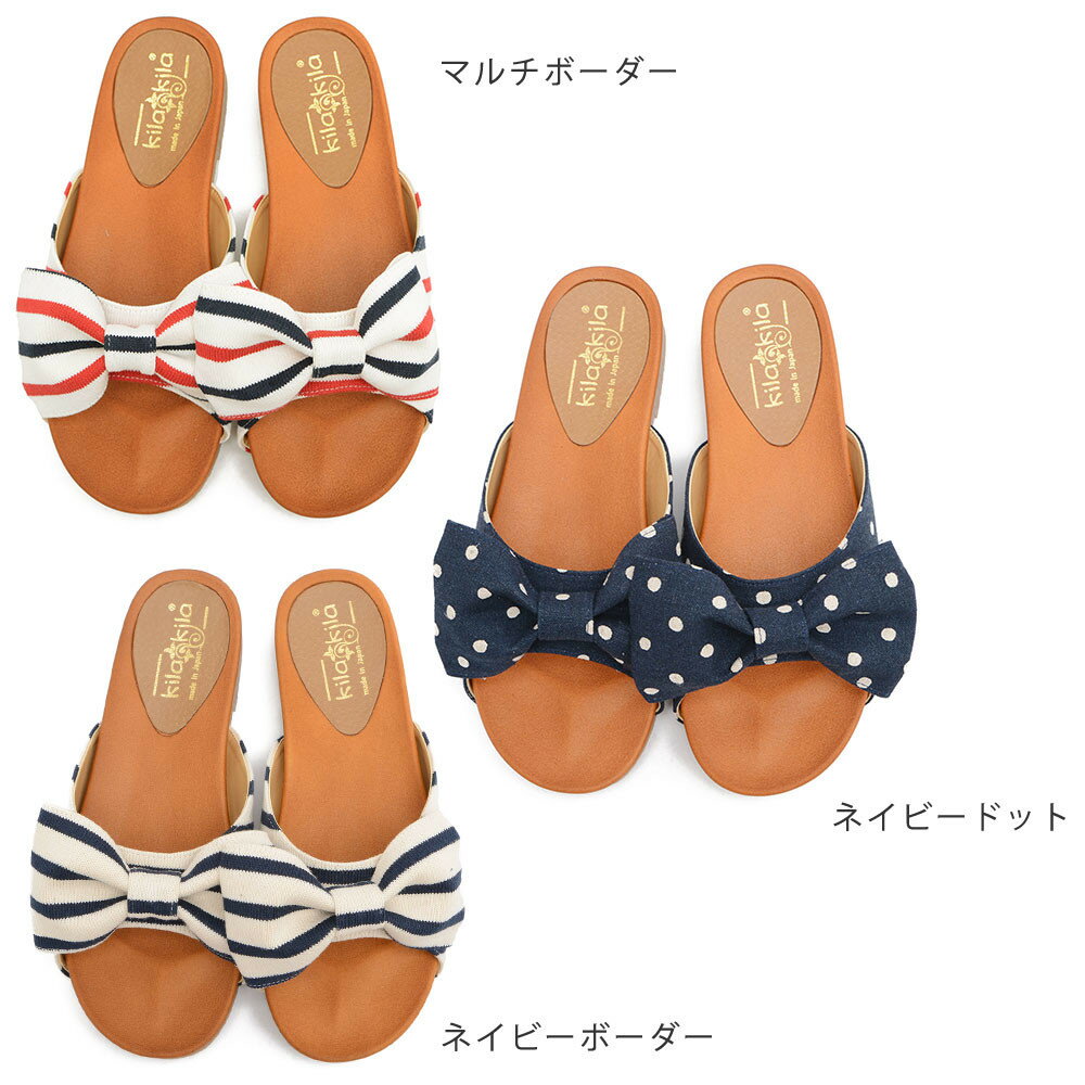 日本製 おおきめリボンがかわいい 靴 サンダル レディース リボン ボーダー つっかけ 楽チン ぺたんこサンダル 大きいサイズ レジャー 観光 バカンス 海 バーベキュー ネイビー ボーダー レッド 赤 デニム L LL 3L